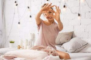 Beautiful,Young,Woman,Sitting,On,Bed,And,Shows,Gesture,Heart