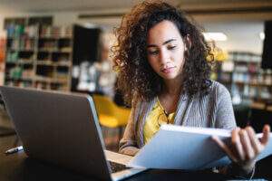 Young,Beautiful,Student,Girl,Working,,Learning,In,College,Library