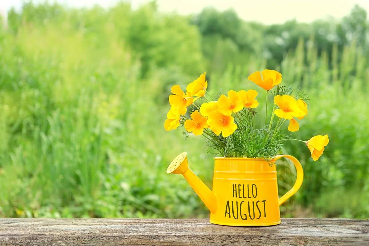 Bright,Flowers,Escholzia,In,Yellow,Watering,Can,On,Table,,Green